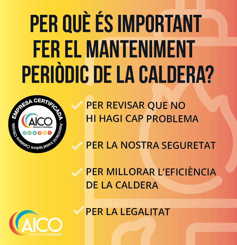 Si no tens cap instal·lador autoritzat des d’AICO et podem ajudar. Consulta la nostra web per trobar-ne un i comença aquest any cuidant de la teva caldera i de la teva llar. La caldera és un dels aparells de casa nostra més importants i per això necessita aquest manteniment per garantir que la tenim en bones condicions i així ens duri molt més temps: https://www.aico.cat/aico-associacio/instal-ladors/